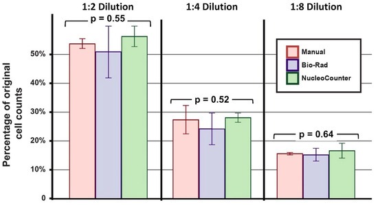 At a 1:2 dilution, the manual hemocytometry method was shown to have the least deviation (7.79 ± 3.30%) in cell count (compared to the undiluted sample), followed by the NucleoCounter (13.06 ± 6.85%) and Bio-Rad automated counter (14.52 ± 3.88%). At a 1:4 dilution (~2.5 × 105 cells/mL), the NucleoCounter exhibited the best accuracy with the least deviation from the undiluted sample (12.49 ± 6.22%), followed by manual hemocytometry (14.58 ± 15.29%) and the Bio-Rad automated counter (17.53 ± 5.48%). At a 1:8 dilution, all methods demonstrated a considerable deviation greater than 20% from the undiluted samples (Table 2).