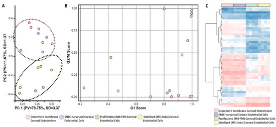 Transcriptomic profiling of human CEnCs. Transcriptomic analysis of the 4 populations of donor-matched primary CEnCs. (A) Principal component analysis (PCA) of donor-matched samples in the 4 conditions (n = 4 biological repeats). (B) Transcriptomic cell cycle analysis showing both G1 and G2/M scores of the donor-matched samples in the 4 conditions (n = 4 biological repeats). (C) Heat map analysis of the similarities and differences in the transcriptomic profiles among 4 groups of corneal endothelial cells, based on the top 50 differentially expressed genes. All experiments were performed with four biological repeats (n = 4).