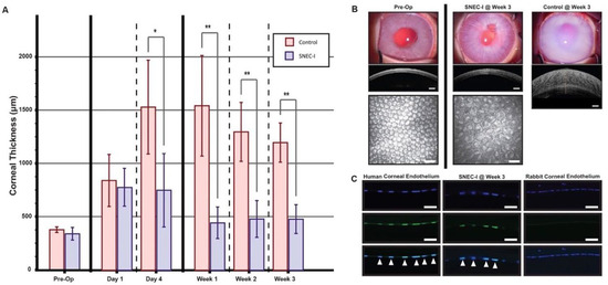 Functionality of SNEC-I in a rabbit model of bullous keratopathy. (A) Graph depicting the mean central corneal thickness in rabbits treated with SNEC-I (n = 3 rabbits; blue) compared to untreated controls (n = 3 rabbits; red) at the following time points: pre-operatively, day 1, day 4, week 1, week 2, and week 3 (* p < 0.05, ** p < 0.01). (B) Representative slit–lamp images and their corresponding anterior segment optical coherence tomography images of corneal thickness taken pre-operatively, as well as at week 3 for SNEC-I-treated and control rabbits (scale bar: 500 μm). In vivo confocal images are also included for both pre-operative and week 3 SNEC-I-treated rabbits (scale bar: 50 μm). (C) Representative immunofluorescent staining of DAPI (top row) and human-specific nuclear antibodies (middle row), with merged images (bottom row) showing co-localization (white arrow). Images include sections from human cadaveric donor corneas (left), excised corneas from rabbits receiving SNEC-I (center), and the contralateral rabbit cornea (right) (scale bar: 50 μm).
