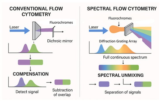 - Nolan, J.P. The evolution of spectral flow cytometry. Cytom. Part A 2022, 101, 812–817. [Google Scholar] [CrossRef] [PubMed]
