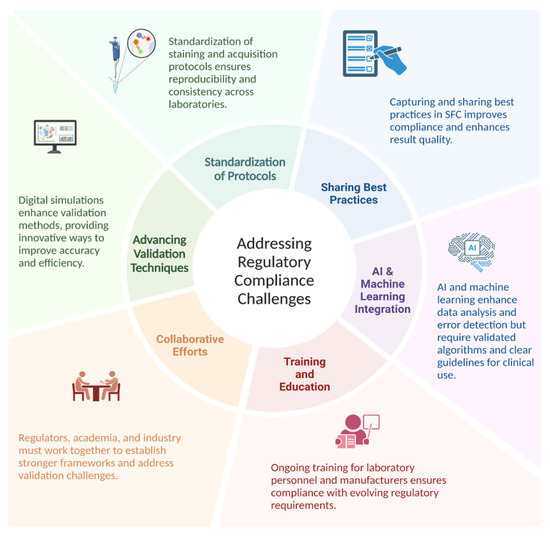 Improving reproducibility and regulatory compliance in SFC requires standardizing protocols, advancing validation techniques, and fostering collaboration among regulators, academia, and the industry. Enhanced training, sharing best practices, and artificial intelligence (AI) integration for data analysis and error detection can streamline validation processes, though these advances also introduce new regulatory challenges that demand clear guidelines and algorithm validation (Figure 2).