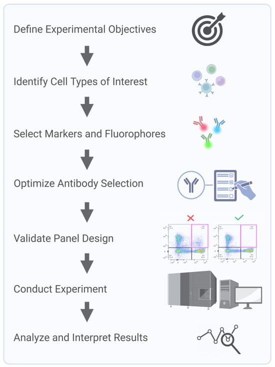 Clinical flow panels for spectral cytometry can incorporate up to dozens of markers. Successful design of these high-dimensional panels requires iterative testing and validation to account for inter-individual variability in marker expression and to ensure a consistent performance across patient populations [22]. Furthermore, the investigator must understand the biology of the samples being interrogated. For example, in leukemia, expression levels and co-expression patterns of markers can be observed that would never be encountered in normal blood cells. Consequently, during panel design and validation steps, clinically relevant samples representative of the range, and a combination of marker expressions that will be encountered, must be used. Panel design using only healthy donor samples will not recapitulate potential problems arising with ectopic or a co-expression of markers not seen in the normal population. Key steps in multicolor panel design and assay optimization for SCF accounts start with a process of defining the experimental question and identifying critical metrics, such as fluorescence intensity, marker frequency, or cell counts, to ensure the design focuses on collecting the most relevant data. Next, markers are carefully selected to accurately define the cell populations of interest, with details recorded in a cell identification table that includes key populations, markers, and co-expressions. Due to variability in marker expression across individuals and disease states, validation is critical to ensure a reliable detection across diverse samples. Key considerations, including target density, fluorochrome brightness, and antibody optimization, are integral to creating a successful and reproducible panel (Figure 3).