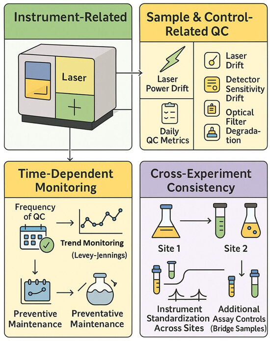 Daily QC ensures cytometers maintain a consistent operational state across time and locations. Flow cytometers benefit from routine QC procedures that test optical alignment, detector sensitivity, and background noise. Daily instrument QC involves running standardized particles to check that the instrument’s performance stays within established tolerances [6].
