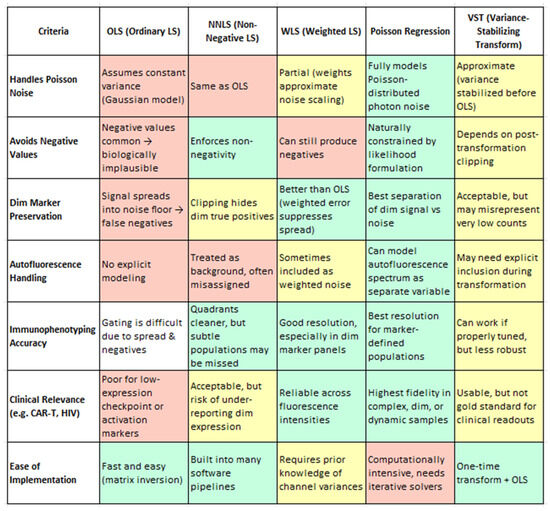 - Novo, D. A comparison of spectral unmixing to conventional compensation for the calculation of fluorochrome abundances from flow cytometric data. Cytom. Part A 2022, 101, 885–891. [Google Scholar] [CrossRef]