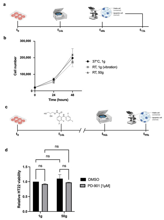 Mouse Hippocampal Neuronal Cells HT22 endure exposure to HG and ERK inhibitor PD-901 both alone and combined. (a) 20,000 cells per group were seeded at T0; the next day, cells were exposed to a gravitational acceleration of 50× g for three hours, at RT. Imaging and viability assays were performed 24 and 48 h later. (b) Viability assays of the three groups of samples: one centrifuged at 50× g (triangles), and two reference groups: one left in the cell incubator (circles), one kept at RT on the centrifuge lid (squares) to sense the vibrations of the operating instrument. Data represent mean ± SEM. Statistical test: Two-way ANOVA, n = 3. (c) Experimental design as in A with the adjunctive step of drug administration, 1μM PD-0325901 (PD-901). (d) Viability assay of HT22 cells exposed to 50× g with 1μM PD-901 (gray) or without (Dimethyl sulfoxide, DMSO, as the vehicle, black). Data represent mean ± SEM. Statistical test: Two-way ANOVA, n = 3, ns = not significant, p > 0.05. Note: ‘n = 3’ is an indication of the number of biological replicas (i.e. number of experiments), each one having its own three technical replicas.
