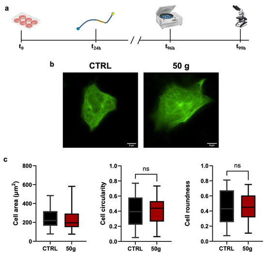 HT22 cells transfected with CST sensor allow visualization of microtubules and endure HG. Tau is an intrinsically disordered protein that, like other natively unfolded proteins, tends to be highly flexible [13]. From being distended when free in the cytosol, Tau shifts to a hairpin structure when bound to microtubules [13]. This change prompted researchers to develop a conformational-sensitive Tau (CST) sensor for measuring the ratio of microtubule-bound Tau versus free Tau in the cytoplasm or aggregated into NFTs. The tool, originally developed by co-authors of this work, takes advantage of a full-length Tau protein carrying two different, terminal fluorophores that work as a FRET couple [29]. (a) Experimental design: cells were seeded, allowed to attach and spread, and transfected with the CST sensor (which emits green fluorescence when excited at 500 nm). Microtubules are visualized in detail because of their binding with CST. 96 h from seeding, cells were centrifuged for three hours and immediately afterward fixed and analyzed under the microscope. (b) Results showed that the cells, both reference (that remained on the centrifuge lid, CTRL) and centrifuged at 50× g, maintained their characteristic elongated and branched shape. All recombinant Tau protein was associated with microtubules; no intracellular deposits were observed. The areas of highest fluorescence correspond to the microtubule organizing centers (MTOCs), which are known to contain a dense concentration of Tau protein. Scale bar: 5 µm. (c) Area, Circularity, and Roundness of live, CST-transfected HT22 cells did not change between CTRL and centrifuged cells. Data represent mean ± SEM. Statistical test: groups were compared with Student’s t-test for unpaired samples, n > 45; ns = not significant. n = 3 independent biological replicas (i.e., number of experiments), each one with at least three technical replicas. For each replica, at least 20 cells were analyzed.