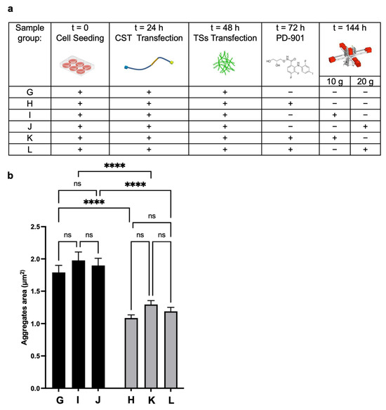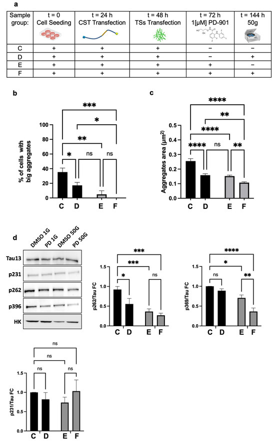 We assessed the percentage of cells with larger aggregates, setting the threshold at the 75th percentile of the reference group (Group C, Figure 5a). We found that Group D (50× g) or Group E (PD-901) had significantly fewer cells exceeding the threshold and, interestingly, without significant difference between the two groups (D and E). However, cells that underwent the combined treatments (Group F) showed no aggregates above the threshold (Figure 5b). These data strongly suggested that 50× g or PD-901 are almost equally effective in reducing the formation of larger Tau aggregates.