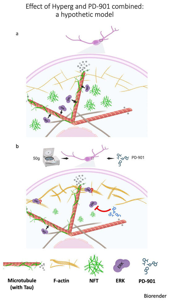 A hypothetical model of the effect of HG on Tau deposition. (a) In a neuronal degenerative model of NFT deposition, the ERK kinase has access to TAU associated with microtubules, causing further NFT deposition. (b) Centrifugation promotes thickening of actin fibers, sequestering ERK. The drugs synergize with this effect [32]. The red question mark suggests the strengthened association of ERK with F-actin upon HG treatment. The red T–bar indicates inhibition of PD–901 on ERK activity.