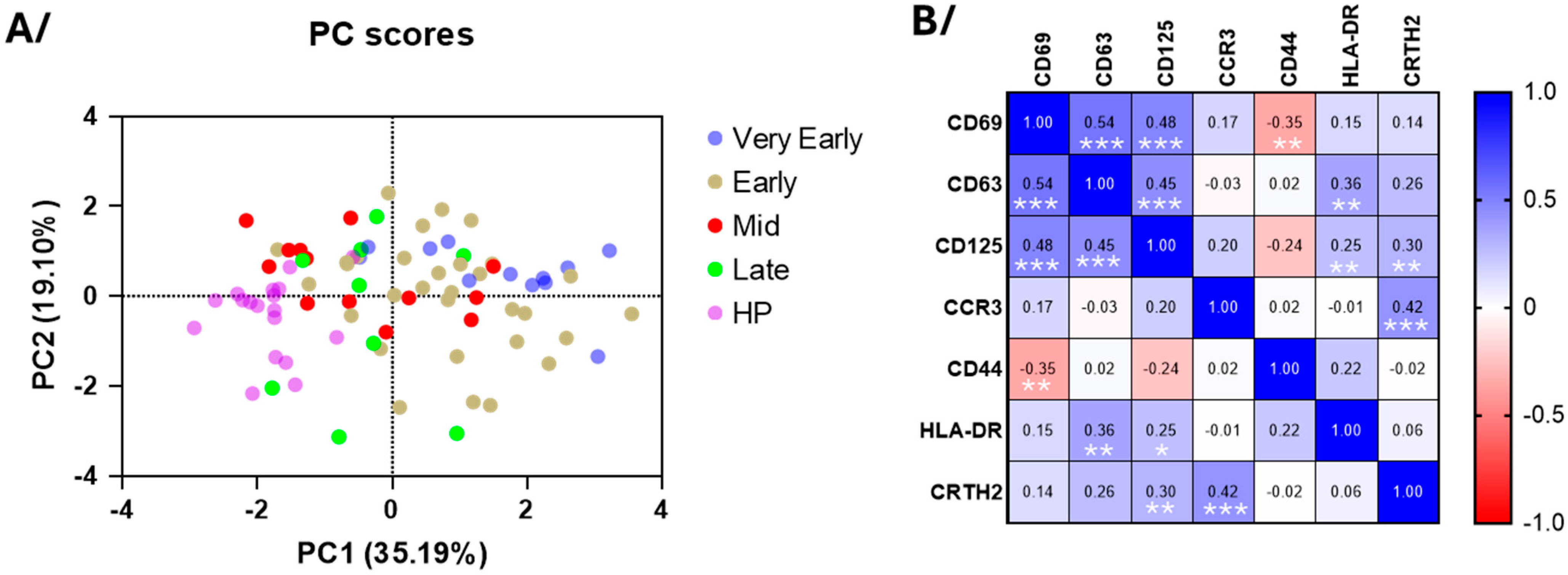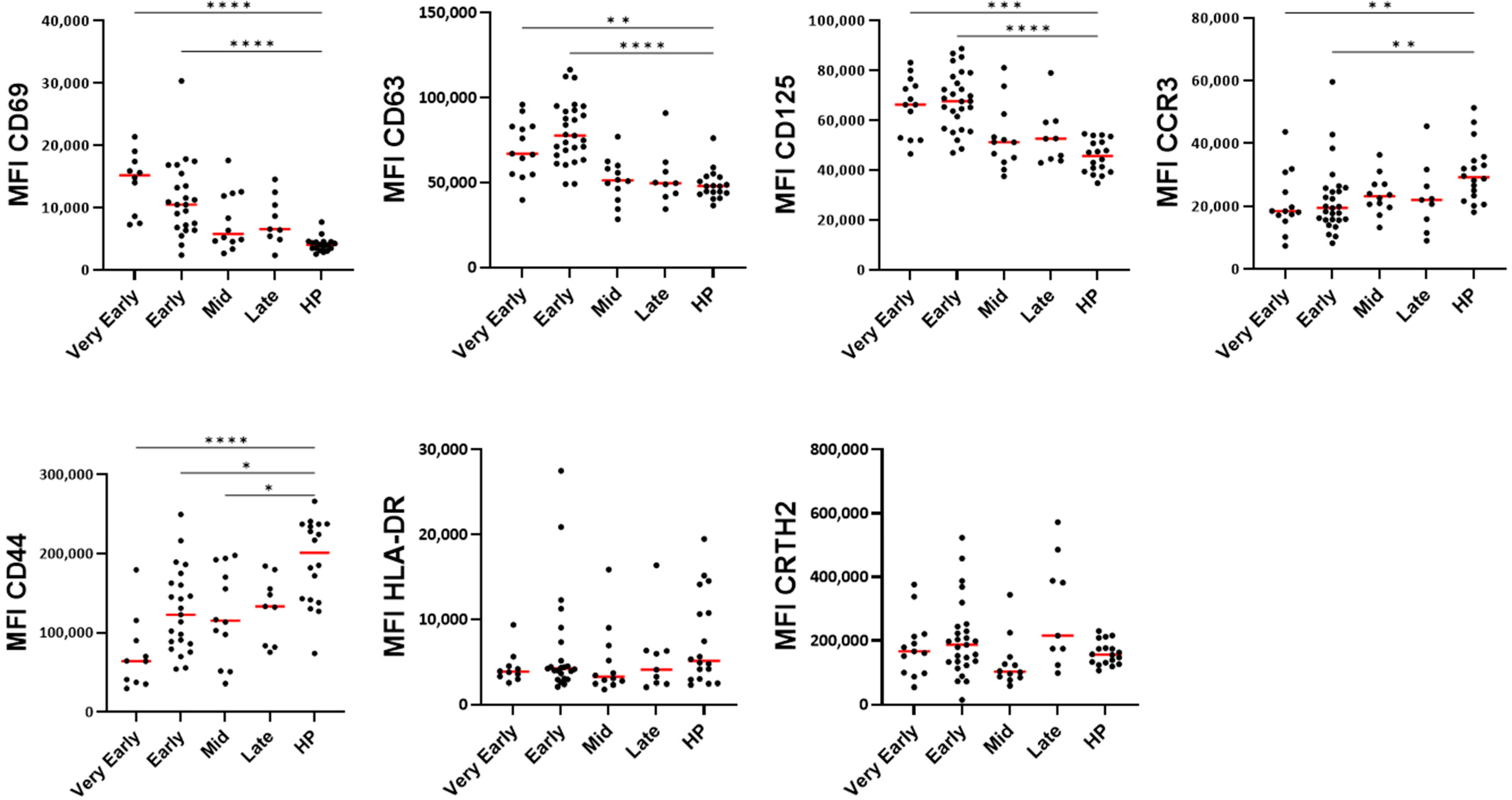 - Dezoteux, F.; Marcant, P.; Dendooven, A.; Delaunay, E.; Esnault, S.; Trauet, J.; Lefevre, G.; Staumont-Salle, D. Enhanced Siglec-8 and HLA-DR and Reduced CRTH2 Surface Expression, Highlight a Distinct Phenotypic Signature of Circulating Eosinophils in Atopic Dermatitis. J. Leukoc. Biol. 2025, 117, qiaf023. [Google Scholar] [CrossRef]