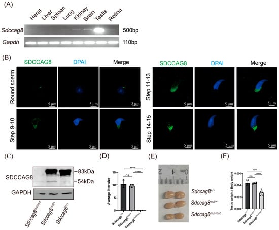 To explore the molecular functions of SDCCAG8 in spermatogenesis, we first investigated its expression and localization. Reverse-transcription PCR (RT-PCR) analysis demonstrated that Sdccag8 was predominantly expressed in the testis, less in the heart, lung, kidney, brain, and retina, and undetectable in the liver and spleen (Figure 1A). Kamio et al. reported that SDCCAG8 is expressed in spermatocytes in the rat testis [51]. In our study, immunofluorescence (IF) analysis revealed that SDCCAG8 was detected as two spots near the nuclei of round spermatids, and it localized to the skirt-like structure encircling the spermatid head and centrosomal region from steps 9 to 15 (Figure 1B), suggesting that SDCCAG8 may be associated with spermatid elongation and flagellum biogenesis.
