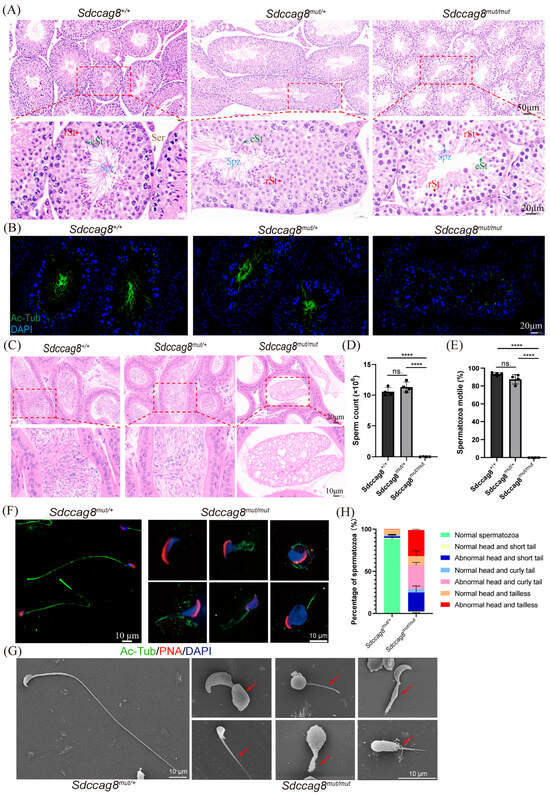 To further characterize the infertile phenotypes of Sdccag8mut/mut males in detail, we used hematoxylin and eosin (H&E) and IF staining to determine the morphology of seminiferous tubules in Sdccag8+/+, Sdccag8mut/mut, and Sdccag8mut/+ mice. We found that the Sdccag8mut/mut mice have normal morphologies and numbers of spermatogonia, spermatocytes, and round spermatids, but their elongated spermatids and spermatozoa were dramatically decreased as compared with the Sdccag8+/+ and Sdccag8mut/+ controls at the age of 2 months (Figure 2A). In addition, there was a significant degeneration of spermatids and severely malformed flagellum of spermatozoa in the mutant testes (Figure 2A). IF analysis using anti-Ac-tub revealed severe abnormalities in the flagellar morphology of Sdccag8mut/mut spermatozoa (Figure 2B), indicating defective Sdccag8mut/mut sperm tails. We then examined the cauda epididymis of 2-month-old Sdccag8+/+, Sdccag8mut/+, and Sdccag8mut/mut male mice by H&E staining. We found fewer spermatozoa in the epididymal lumen of the Sdccag8mut/mut mice than those of the age-matched WT and HET mice (Figure 2C). After dispensing the spermatozoa from the epididymis, we found that the sperm count and mobility were dramatically reduced in Sdccag8mut/mut mice compared to WT and HET mice (Figure 2D,E). As there were no significant differences in male fertility, sperm number, and motility between HET and WT mice, we used the Sdccag8mut/+ mouse as the normal control hereafter.