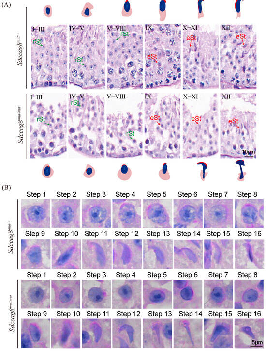 Spermiogenesis, which begins with the mitotic proliferation of spermatogonia in the mouse seminiferous epithelium, could be divided into 12 stages (I–XII) or 16 steps (1–16) based on sperm head and acrosome morphologies [52]. To investigate which stages of spermiogenesis are first interrupted by the Sdccag8 mutation, we examined the morphology of spermatids across the spectrum of spermiogenesis stages by periodic acid Schiff (PAS) staining of testis sections (Figure 3A). There was no difference observed in spermatid morphologies until stage Ⅷ between 2-month-old Sdccag8mut/mut mice and the age-matched controls (Figure 3A). The morphology of the acrosome and nuclei of the Sdccag8mut/mut spermatids was as normal as that of the controls during steps 1–8 (Figure 3B). However, deformed spermatid heads and abnormally elongated sperm heads were observed in Sdccag8mut/mut testes following stage Ⅸ, and the number of their elongated spermatids was gradually reduced compared to controls (Figure 3A). Moreover, abnormal elongation of the spermatid head was observed from steps 9–16, characterized by abnormal club-shaped nuclei (Figure 3B).