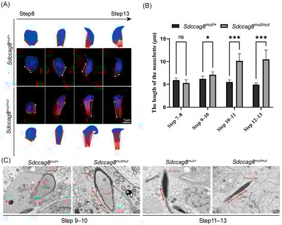3.3. The Sdccag8 Mutation Disrupts Spermiogenesis by Causing Abnormal Manchette Formation and Nuclear Elongation