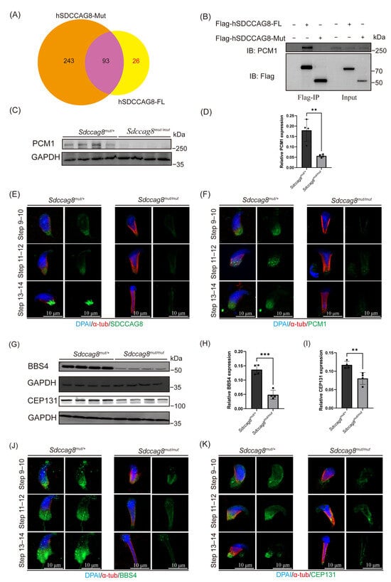 Sdccag8 c.1351–1352insG mutation destabilizes PCM1 in spermatids and disrupts the centriolar satellites’ integrity. (A) Venn diagram showing overlap of proteins between the Flag-hSDCCAG8-FL binding proteins and the Flag-hSDCCAG8-Mut binding proteins. (B) Co-immunoprecipitation analysis of SDCCAG8 and PCM1. (C) Immunoblot analysis of PCM1 and SDCCAG8 in testes of Sdccag8mut/+ and Sdccag8mut/mut. GAPDH was used as a loading control (n = 4). (D) Quantitative results of immunoblot. The protein level of PCM1 was normalized against GAPDH levels. Data are presented as means ± SD. Two-tailed Student’s t test; ** p < 0.01. (E,F) Representative images of spermatids obtained from Sdccag8mut/mut and Sdccag8mut/+ mice testes co-stained with anti-α-tubulin, DAPI (blue), and anti-SDCCAG8 (E), and anti-PCM1 (F) (red). Scale bar: 10 µm. (G) Immunoblot analysis of protein expression level of BBS4 and CEP131 in protein lyases from Sdccag8mut/+ and Sdccag8mut/mut testes. GAPDH served as a loading control (n = 4). (H,I) Quantitative results of immunoblot. Protein levels of BBS4 (H) and CEP131 (I) were normalized against GAPDH levels. Data are presented as means ± SD. Two-tailed Student’s t test; ** p < 0.01, *** p < 0.001. (J,K). Representative images of spermatids obtained from Sdccag8mut/mut and Sdccag8mut/+ mice co-stained with anti-α-tubulin (red), DAPI (blue), and anti-BBS4 (green) (J), and anti-CEP131 (green) (K). Scale bar: 10 µm.