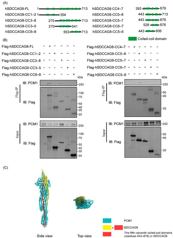 The region consisting of the fifth to the seventh coiled-coil domains in SDCCAG8 (residues 443–676) is essential for the interaction with PCM1. (A) Schematic diagrams of human SDCCAG8-FL, -CC1–2, -CC3–8, -CC3–5, -CC6–8, -CC4–7, -CC5–8, -CC5–7, -CC6–7, -CC7–8. (B) Co-immunoprecipitation analysis of hSDCCAG8 and endogenous PCM1. (C) Binding model of SDCCAG8 and PCM1 was constructed by AlphaFold 3 (https://golgi.sandbox.google.com/about) (accessed on 4 June 2024). The protein complex is visualized by PyMOL. The region of the fifth–seventh coiled-coil domains (residues 443–676) marked by red located in the core area of this protein–protein complex.