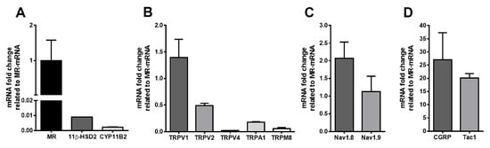 3.1. mRNA Transcript Detection of MR Together with Its Protecting Enzyme 11ß-HSD2 and Its Endogenous Ligand-Processing Enzyme CYP11B2 in Human Sensory DRG Neurons