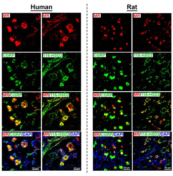 3.2. MR Receptor Detection in CGRP-IR Sensory Neurons Colocalizing with Its Protecting Enzyme 11ß-HSD2 in Human and Rat DRG Neurons