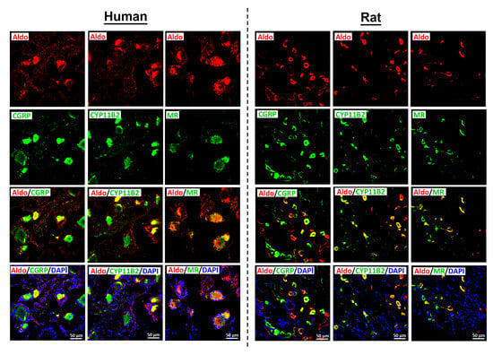 3.3. Identification of the MR Endogenous Ligand Aldosterone with Its Processing Enzyme CYP11B2 in Human and Rat DRG Neurons