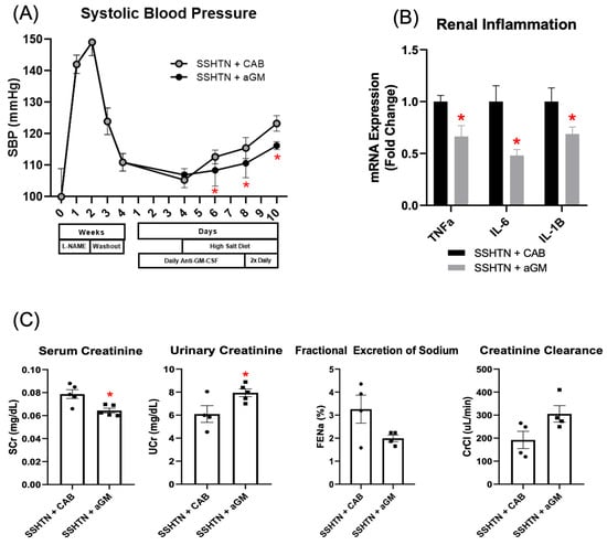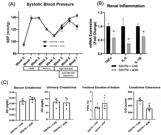 Inhibition of granulocyte-macrophage colony-stimulating factor prior to the induction of salt-sensitive hypertension attenuated systolic blood pressure, lowered renal inflammatory gene expression, and mitigated renal function. (A) SBP measurements in CAB-treated and aGM-treated SSHTN mice (n = 4–5). BP was recorded weekly for four weeks and every other day for the final 7 days using the tail-cuff method. (B) Renal expression of inflammation-related genes in CAB-treated and aGM-treated SSHTN mice (n = 4–5). (C) Serum creatinine and urinary creatinine concentrations, FENa, and creatinine clearance in CAB-treated and aGM-treated SSHTN mice (n = 4–5). BP data is presented as the mean ± SD and statistical analyses were performed with an unpaired Student’s t-test, * p < 0.05 vs. SSHTN + CAB. All other data are presented as the mean ± SEM and statistical analyses were performed with an unpaired Student’s t-test, * p < 0.05 vs. SSHTN + CAB.