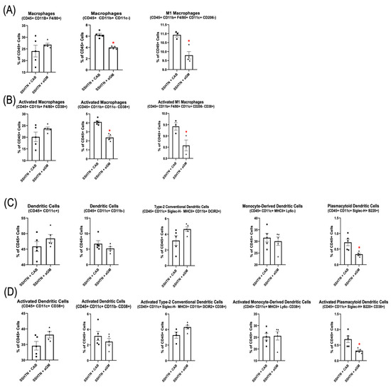 To evaluate the impact of aGM on renal immune cells, we performed flow cytometry to characterize renal Mac and DC subsets. Renal Macs (CD45+ CD11b+ CD11c−) and CD38+ Macs (CD45+ CD11b+ CD11c− CD38+) were decreased significantly in SSHTN mice treated with aGM (Figure 2A,B). Renal M1 Macs (CD45+ CD11b+ F4/80+ CD11c+ CD206−) and CD38+ M1 Macs were also decreased significantly (Figure 2A,B). Plasmacytoid DCs (pDCs; CD45+ CD11c+ Siglec–H+ B220+), and CD38+ pDCs were decreased significantly in SSHTN + aGM mice (Figure 2C,D). Preventive treatment with aGM induced distinct effects on renal Mac and DC subsets, with some subsets showing decreased populations and others unaffected.