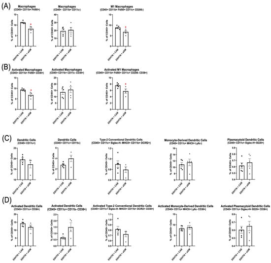 Anti-granulocyte-macrophage colony-stimulating factor treatment differentially affected renal Mac and DC subtypes. Renal flow cytometry data assessing (A) Mac populations, as well as their (B) CD38+ counterparts, along with (C) DC populations and (D) their CD38+ counterparts in CAB-treated and aGM-treated SSHTN mice (n = 4–5). Data are presented as the mean ± SEM and statistical analyses were performed with an unpaired Student’s t-test, * p < 0.05 vs. SSHTN + CAB.
