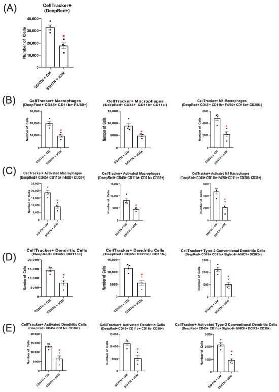 To investigate whether immune cell trafficking to the kidneys could be reduced, we adoptively transferred BMDMs treated with aGM into SSHTN mice. We found that significantly fewer CellTracker+ aGM-treated cells migrated to the kidneys in mice with SSHTN (Figure 5A). Additionally, fewer CellTracker+ aGM-treated cells differentiated into Macs (CD45+ CD11b+ F4/80+ and CD45+ CD11b+ CD11c−) and CD38+ Macs within the kidneys (Figure 5B,C). Similarly, fewer of these cells differentiated into M1 Macs and CD38+ M1 Macs.