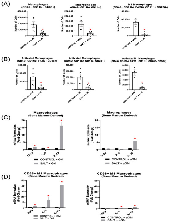 Our results demonstrate that inhibiting GM-CSF prior to salt treatment decreased BMD-Macs, along with their respective CD38+ subsets (Figure 6A,B). Notably, BMD-M1 Macs, including CD38+ BMD-M1 Macs, were also reduced significantly (Figure 6A,B). Further analysis of unsorted BMD-Macs revealed that when cultured with GM-CSF and exposed to salt, Tnfα and IL-1β gene expression were increased significantly, and Il-6 expression was decreased significantly. However, when BMD-Macs were treated with aGM before salt exposure, Tnfα expression returned to baseline levels, Il-6 remained decreased, and Il-1β, although still elevated, exhibited a lower fold change compared to GM-CSF-treated cells (Figure 6C). Additionally, when BMDMs were differentiated into BMD-Macs with GM-CSF, then exposed to salt and sorted for CD38+ BMD-M1 Macs (CD11b+ CD11c+ CD206− CD38+), they exhibited significantly increased expression of Tnfα, Il-6, and Il-1β (Figure 6D). However, aGM treatment before salt exposure restored Tnfα expression to baseline, significantly reduced Il-6 gene expression, and blunted—but did not fully normalize Il-1β expression (Figure 6D).