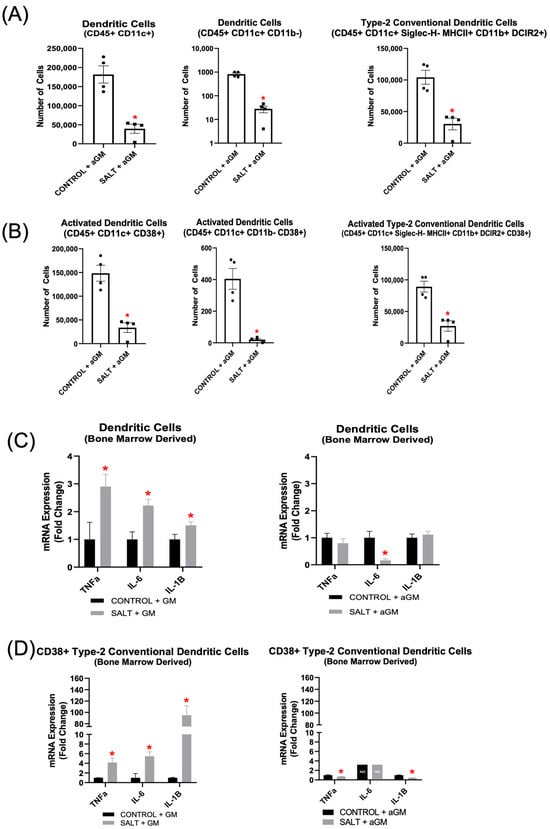 Analysis of aGM-treated BMD-DC populations revealed similar decreases in immune cell subsets, with both BMD-DC phenotypes and their CD38+ subsets showing reductions (Figure 7A,B). Additionally, BMD-cDC2s and CD38+ BMD-cDC2s were decreased further after aGM treatment as well (Figure 7A,B). Further analysis of unsorted BMD-DC populations cultured with GM-CSF and exposed to salt revealed significantly increased expression of Tnfα, Il-6, and Il-1β. However, when BMD-DCs were treated with aGM prior to salt exposure, Il-6 expression was decreased significantly, while Tnfα and Il-1β expression returned to baseline (Figure 7C).