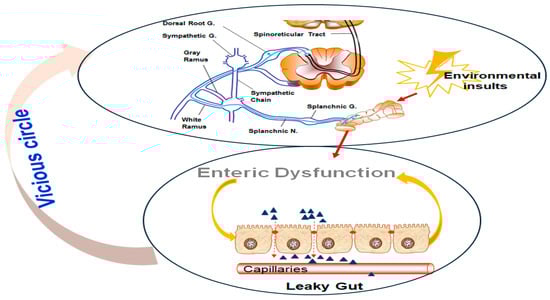 The vicious cycle of environmental insults, enteric dysfunction, and visceral hypersensitivity. (Upper panel) A neural pathway involving the splanchnic nerves and sympathetic chain, which respond to environmental insults, triggers nociceptive signaling. These signals are relayed through the DRG and spinoreticular tract, further exacerbating the stress response. (Lower panel) Enteric dysfunction is characterized by leaky gut syndrome, where compromised intestinal epithelial barrier integrity allows increased permeability to harmful molecules. This dysfunction amplifies systemic inflammation and sensitizes neural pathways, forming a feedback loop (vicious cycle) that perpetuates visceral hypersensitivity and chronic gut dysfunction.
