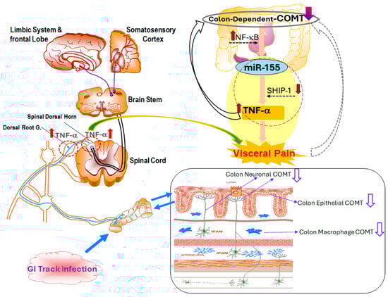 Recent studies have shown that loss or reduced expression of COMT not only affects catecholamine metabolism but also contributes to increased production of pro-inflammatory cytokines, particularly TNF-α, via a downstream miRNA-dependent mechanism. Specifically, decreased COMT activity leads to upregulation of miR-155, which in turn promotes TNF-α expression in enteric neurons and macrophages [] (Figure 2). TNF-α then acts on nociceptive pathways to sensitize colonic and dorsal root ganglion (DRG) neurons, thereby enhancing visceral pain signaling [].