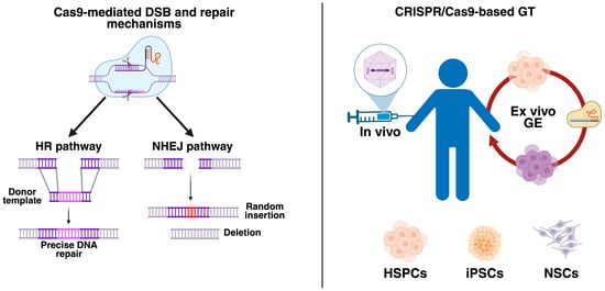 The classical CRISPR/Cas9 system and its use as a gene therapy (GT) approach. (Left panel) The classical CRISPR/Cas9 system requires a double-strand break (DSB) within the DNA mediated by an RNA-guided Cas9 protein. Upon DSB, the cell activates two central repair mechanisms: the homologous recombination (HR) and non-homologous end-joining (NHEJ) pathways. While HR is predominant in dividing cells, the NHEJ is active in both dividing and non-dividing cells. Most importantly, HR needs a donor template with homologous arms to be inserted into the host genome. Without a donor template, the NHEJ mediates the DSB repair, producing random insertions or deletions known as indels. (Right panel) The CRISPR/Cas9 system can be used for in vivo and ex vivo genome editing (GE). Likewise, current studies have demonstrated the suitability of hematopoietic stem progenitor cells (HSPCs), induced pluripotent stem cells (iPSCs), and neural stem cells (NSCs) for ex vivo CRISPR/Cas9-based GTs. This figure was created with Biorender.com.