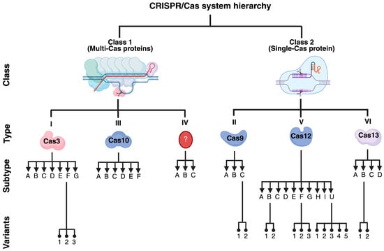 The CRISPR/Cas system is an adaptive immune system in prokaryotes [8,9]. The locus CRISPR harbors short repetitive elements separated by spacers and a series of CRISPR-associated (Cas) genes that encode for Cas proteins. During an invasion by bacteriophages, transposons, or plasmids, the CRISPR/Cas locus is activated to induce Cas-mediated cutting of foreign DNA [8]. The released DNA fragments are later inserted into the CRISPR locus as new spacers, conferring variability to the system. Upon re-infection by the same invader, a CRISPR-associated RNA (crRNA) recognizes the foreign genetic material and mediates Cas-dependent cleavage, thereby protecting the host [26]. The CRISPR/Cas systems are classified into two classes, six types, thirty-three subtypes, and seventeen variants (Figure 2) [27].