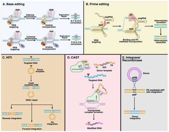 - Wang, X.; Xu, G.; Johnson, W.A.; Qu, Y.; Yin, D.; Ramkissoon, N.; Xiang, H.; Cong, L. Long sequence insertion via CRISPR/Cas gene-editing with transposase, recombinase, and integrase. Curr. Opin. Biomed. Eng. 2023, 28, 100491. [Google Scholar] [CrossRef] [PubMed]