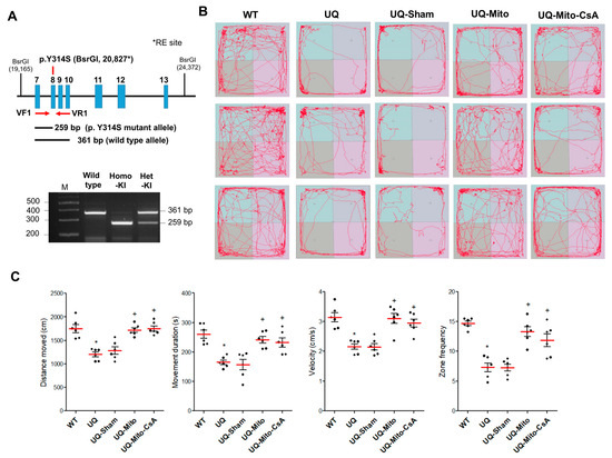 To confirm the successful generation of UQCRC1 p.Y314S knock-in (KI) mice, a CRISPR-Cas9 gene-editing strategy was used. As shown in Figure 1A (top), the targeted mutation (c.941A > C; p.Y314S) was introduced into exon 8, along with a BsrGI restriction site for allele-specific genotyping. PCR primers flanking the site amplified a 361 bp fragment from the WT allele, which was cut to 259 bp if the mutation was present. The genotyping results (Figure 1A, bottom) showed distinct patterns that wild-type mice had a 361 bp band, heterozygous KI mice had both 361 bp and 259 bp bands, and homozygous KI mice had only the 259 bp band. Compared with the dense trajectories of WT littermate controls, UQ mice, including those treated with the vehicle buffer (UQ-Sham), presented a marked reduction in locomotive activity, with sparse movement patterns. In contrast, both the UQ-Mito and UQ-Mito-CsA groups exhibited significant recovery, with movement patterns closely resembling those of the WT group (Figure 1B). Quantitative analysis of movement parameters, including total distance moved, duration, velocity, and zone crossings, consistently revealed that, compared with the UQ and UQ-Sham treatments, the UQ-Mito and UQ-Mito-CsA treatments led to substantial improvements. Although UQ-Mito showed slightly better levels of enhancement, the difference was not statistically significant (Figure 1C). These findings revealed that the transplantation of mitochondria pretreated with or without CsA significantly improved locomotion and exploratory behavior in UQ mice.