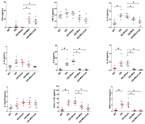 The multiplex analysis of cytokines and chemokines, as shown in Figure 4, revealed consistently higher levels in the UQ group than in the WT group, particularly for interleukin (IL)-1α, IL-6, IL-10, CXC chemokine ligand 1 (CXCL-1)/KC, and monocyte chemoattractant protein-1 (MCP-1)/chemokine ligand 2 (CCL2), with statistically significant differences observed. Sham treatment did not significantly alter these elevated levels. However, treatment with Mito or Mito-CsA resulted in a marked reduction in all the measured parameters, with the exception of a dramatic increase in IFN-γ. Notably, the Mito-CsA group exhibited a more pronounced inhibitory effect than the Mito group, although the difference was not statistically significant (Figure 4).