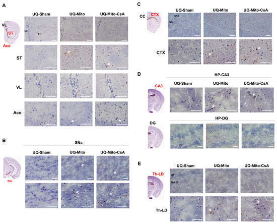 Differences in the brain distribution of delivered mitochondria with or without CsA treatment in UQCRC1 mutation (p.Y314S) knock-in mice. BrdU immunohistological staining was used to trace the mitochondrial distribution at 6 months post-intranasal administration. (A–E) shows the brain atlases of different regions with highlighted areas and corresponding enlarged histological images. The brain regions highlighted in red indicate BrdU-positive signals in the (A) striatum (ST) and anterior commissure (Aco), (B) substantia nigra pars compacta (SNc), (C) cortex (CTX), (D) hippocampal CA3, and (E) lateral dorsal nucleus of the thalamus (Th-LD), where significantly more BrdU staining (deep brown color, as indicated by the arrow) was observed than in the sham group. N = 3 per group. Scale bar: 50 μm. Abbreviations: UQ-Sham, vehicle-treated diseased mice; UQ-Mito, mitochondria-treated diseased mice; UQ-CsA-Mito, CsA-accumulated mitochondria-treated diseased mice; LV, lateral ventricle; CC, corpus callosum.