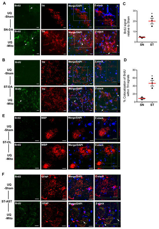 To investigate whether the abundant BrdU signals in the ST region appear in other brain cell types, we analyzed merged and Z-section images with double staining for BrdU and myelin basic protein (MBP, an oligodendrocyte marker, Figure 6E) or glial fibrillary acidic protein (GFAP, an astrocyte marker, Figure 6F). The BrdU signals co-localized with GFAP (Figure 6F, arrows) but not with MBP, indicating that GFAP-labeled astrocytes incorporated the transplanted mitochondria.