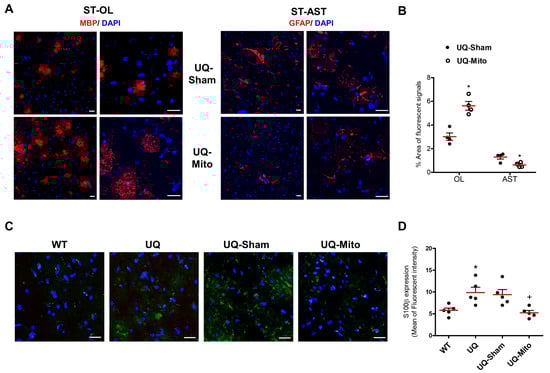 In addition, in the Mito group, MBP signals were significantly increased, whereas GFAP signals were suppressed compared with those in the Sham group (Figure 7A,B), indicating that mitochondrial transplantation increased the population of oligodendrocytes while simultaneously reducing that of astrocytes. Moreover, immunofluorescent staining of S100β, a marker for astrocytes, in the ST across different experimental groups revealed an increased S100β signal in the UQ and UQ-Sham groups compared to WT, indicating enhanced reactive ASTs in the disease mice. Notably, the UQ-Mito group exhibited a reduction in S100β expression relative to UQ-Sham, suggesting a potential modulatory effect of mitochondrial treatment on astrocyte activation (Figure 7C,D).
