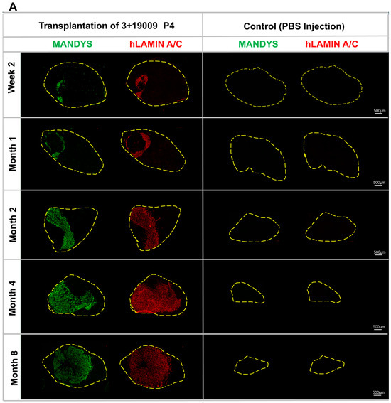 To quantify the extent of engraftment at various time points, images were captured from sections of the middle region of each TA muscle. The cross-sectional area (CSA) of the engrafted domain, identified by human-specific MANDYS (green) and human Lamin A/C (red) staining in Figure 3A. The percentage of the engrafted area was measured using ImageJ and compared to the total TA CSA (Figure 3C). For each time point, three TA muscles from three different mice were analyzed.
