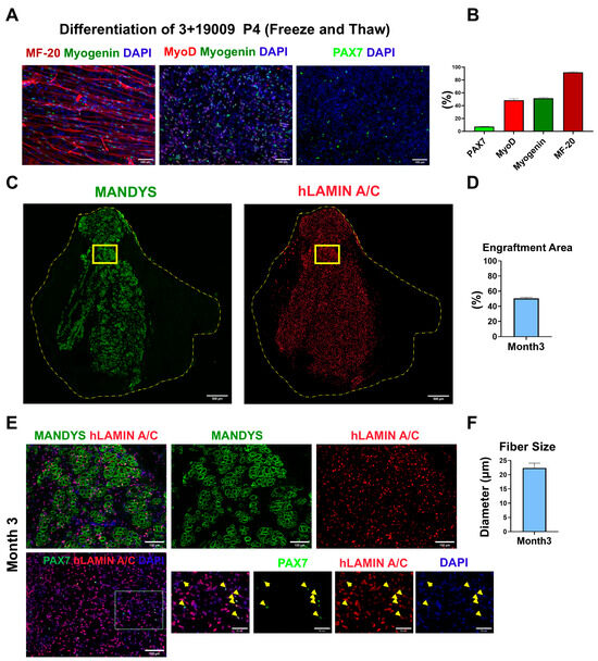 Because generation of teratomas is time-consuming, we tested whether a batch of teratoma-derived cells could be cryo-preserved, expanded at a later date, and retain engraftment capacity. We froze triple-positive cells at passage 1 and thawed them one month later. At passage 4, their in vitro myogenic potential was evaluated, and as shown in Figure 7A, these cells successfully differentiated into myotubes, with most nuclei positive for Myogenin. The percentage of cells positive for PAX7, MyoD, Myogenin, and MF-20 in these differentiation cultures is presented in Figure 7B. We also transplanted undifferentiated cells at passage 4, analyzing 3 months post-transplant, and found that they could engraft and form muscle fibers in a manner similar to that seen with fresh cells (Figure 7C). We also confirmed that grafts contained PAX7+ human cells in the engrafted area (Figure 7E). These data suggest that the freeze–thaw process did not compromise the in vivo regenerative potential of the cells.