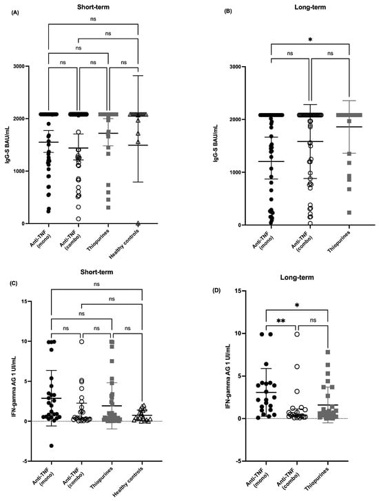 Short- and long-term quantitative humoral and cellular immune responses to SARS-CoV-2 mRNA vaccination between groups. (A) Short-term IgG-S median concentrations. (B) Long-term IgG-S median concentrations. (C) Short-term AG1-NIL median concentrations. (D) Long-term AG1-NIL median concentrations. * p < 0.05, ** p < 0.01.