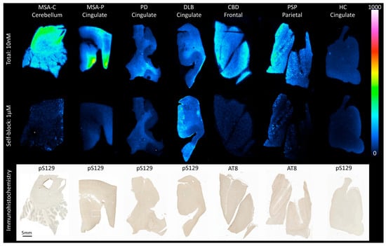 Autoradiography showing total binding using 10 nM [3H]HY-2-15 (upper panel) and non-specific binding (middle panel; determined with addition of 1 μM cold HY-2-15) of postmortem FFPE brain sections containing the cerebellum from MSA-C, the cingulate cortex from MSA-P, PD, DLB, and HC, the frontal cortex from CBD, and the parietal cortex from PSP cases. Autoradiography color/brightness threshold levels are expressed in counts (0–1000). Per MSA-C, MSA-P, PD, DLB, and HC cases, pS129 α-syn IHC (lower panel) was performed on adjacent sections as pathology reference, while for CBD and PSP, AT8 IHC was carried out. pS129, anti-phospho129 α-syn antibody; AT8, anti-phosphorylated tau antibody. Scale bars: 5 mm. MSA-C, multiple system atrophy—cerebellar subtype; MSA-P, multiple system atrophy—parkinsonian subtype; PD, Parkinson’s disease; DLB, dementia with Lewy bodies; CBD, corticobasal degeneration; PSP, progressive supranuclear palsy; and HC, healthy control.