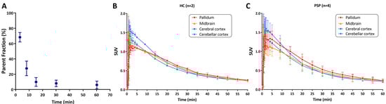 (A) Parent fraction of [11C]HY-2-15 from arterial blood samples. Time–activity curves of pallidum, midbrain, cerebral cortex, and cerebellar cortex in SUV for (B) HC and (C) PSP. Data is presented as mean ± standard deviation. HC, healthy control; PSP, progressive supranuclear palsy; and SUV, standardized uptake value.
