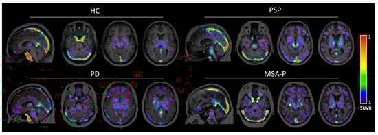 Representative 15–35 min [11C]HY-2-15 SUVR image with a whole brain mask of HC, PSP, PD, and MSA-P in the sagittal and axial views of cerebellum, midbrain, and basal ganglia. HC, healthy control; PSP, progressive supranuclear palsy; PD, Parkinson’s disease; MSA-P, multiple system atrophy—parkinsonian subtype; and SUVR, standardized uptake value ratio.