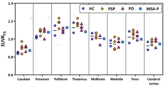 Scatter plot of brain regional [11C]HY-2-15 SUVRs in HC, PSP, PD, and MSA-P. HC, healthy control; PSP, progressive supranuclear palsy; PD, Parkinson’s disease; MSA-P, multiple system atrophy—parkinsonian subtype; and SUVRCb, standardized uptake value ratio using cerebellar cortex as reference region.