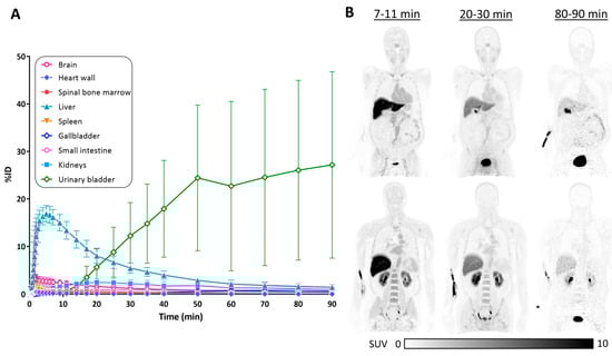 - Akamatsu, G.; Nishio, T.; Adachi, K.; Ikari, Y.; Senda, M. Whole-body biodistribution and the influence of body activity on brain kinetic analysis of the 11C-PiB PET scan. Radiol. Phys. Technol. 2017, 10, 464–474. [Google Scholar] [CrossRef]