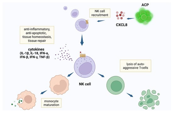The high level of ACP secretion of CXCL8 exhibits specific chemokine activity for NK cells [18,19,20]. CXCL8 is the most potent human neutrophil-attracting chemokine, playing a dominant role in response to infection and tissue injury, the activity of which depends upon interaction with human CXC chemokine receptors CXCR1 and CXCR2 [21]. CXCR1/2 receptors—expressed on NK cells, myeloid-derived epithelial cells, and other cell types [22]—are highly specific to CXCL8 [23,24]. Moreover, CXCL8 exhibits a systemic effect that extends to remote populations of NK cells (Figure 1). As part of the innate lymphoid cell population, NK cells suppress inflammation through receptor—ligand interactions and cytokine secretion. NK cytokine release alters Th subtype, lysing auto-aggressive T cells, and accelerating the maturation of monocytes and dendritic cells [25,26]. NK cells express IFNγ—a potent immune-modulator—and other mediators which create an anti-inflammatory chemokine environment that inhibits the assembly of inflammatory cells, limiting both fibrosis and apoptosis [27,28]. NK cells serve in the first line of defense against intracellular pathogens through the expression of type I interferons—IFN-α, IFN-β, and IFN-γ—enhancing the expression of major histocompatibility complex molecules of antigen-presenting cells, and initiating an anti-viral inflammatory cascade, preventing viral replication by detecting and destroying the infected resident cells [29,30]. NK cells are protective against pathogens—such as coxsackievirus B and cytomegalovirus—causing meningitis, encephalitis, seizures, and myelitis.
