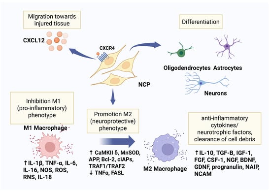 Neural progenitor cells (NCPs) have CXCR4 receptors and migrate towards CXCL12 released by injured tissue. NCPs promote the M2 (neuroprotective) macrophage phenotype, which release anti-inflammatory factors. The NCPs differentiate into neural, glial, or oligodendrocytic cells. Created in BioRender. Tuchman, K. (2025) https://BioRender.com/36j1vy7.