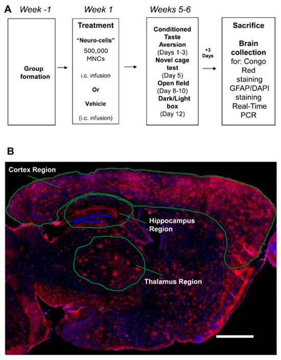 In this study, we administered NC (containing human MSCs and CD34+ HSCs) or vehicle into the cisterna magna of 12-month-old female APP/PS1 mice and their wild-type (WT) littermates. Five to six weeks later, we assessed cognition, emotion, locomotion, and anxiety-related behaviors. To evaluate AD pathology, we quantified amyloid plaque density (Congo red) and astrocyte activation (GFAP/DAPI) in the hippocampus, thalamus, and cortex. We also measured prefrontal cortex expression of pro-inflammatory cytokines (Il-1β, Tnf, Il-6) and AD-relevant genes linked to regeneration and cellular plasticity (Cd45, Stat3, Tubb3, Trem2, Bace1). Finally, to evaluate systemic anti-inflammatory activity, we analyzed IL-6 secretion from human monocytes challenged with LPS.