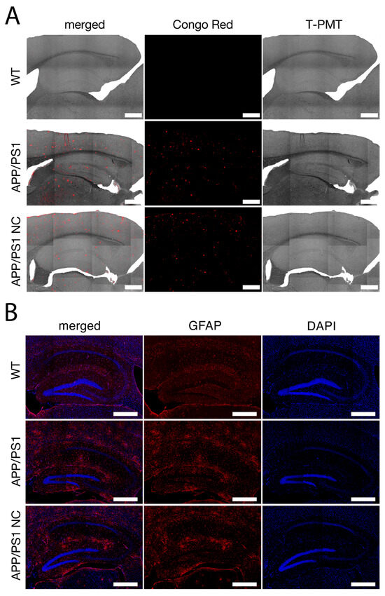 Representative images of the Congo red-stained amyloid plaques and astroglia. (A) Representative images of the mouse brains stained with Congo red of WT mice, non-treated APP/PS1, and APP/PS1-NC groups. Scale bar: 500 μm. (B) Representative images of hippocampal zone of mouse brain stained with anti-GFAP (red) and merged with DAPI staining. Scale bar: 500 μm.